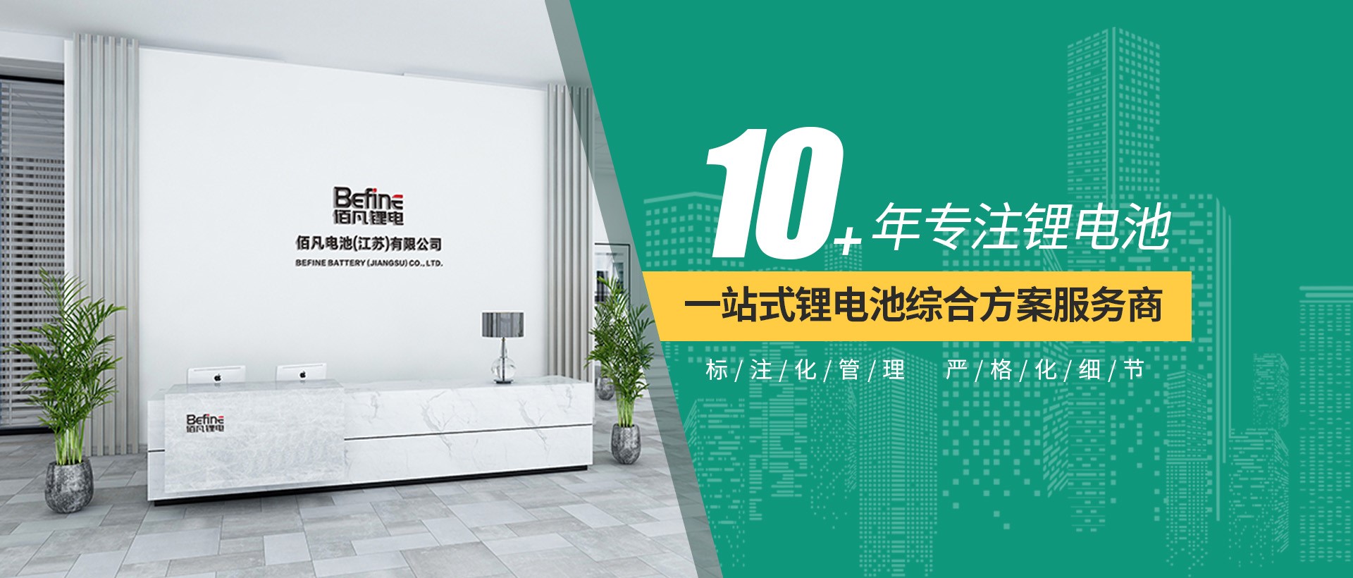 佰凡電池(江蘇)有限公司坐落于無錫國家新能源產業基地,為園區重點扶持的新能源企業。是一 家專業研發、生產和銷售鋰離子電池的新能源企業,公司擁有完善的研發,生產,銷售,售后體系。以 提供“優質、安全、環保”的鋰電池產品為使命。憑借著持續的自主研發創新和設計能力,良好的成本 控制體系和優質的產品服務,被許多知名的企業所認可并發展為戰略合作伴。 佰凡電池(江蘇)有限公司自成立以來,在研發、生產、品質、銷售等方面吸收國際上先進的管理經 驗,嚴格貫徹執行ISO9001體系標準,制造車間配備先進的生產設備和一流的檢測儀器,嚴格控制每一 步制作環節,通過工藝上不斷的優化和完善,確保為客戶提供一流品質產品。 佰凡電池(江蘇)有限公司先后通過CE,ISO9001等相關認證,并擁有多款UN38.3航空運輸報告,公司 自主開發有多款鋰電池外殼模具,產品專注于機器人,AGV,軍工,醫療,通信,精密儀器,鋰電池 UPS等高新領域!